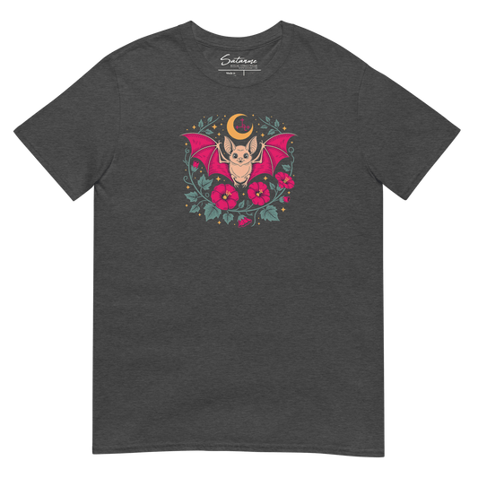 Bat & Bloom Shirt - BlackNight doesn’t only conceal, by the light of the moon, it reveals. The Bat & Bloom shirt takes flight on soft, ring-spun cotton, with artwork that marries shadow and bloom. An adorable wide-eyed bat spreads rose-pink wings beneath a crescent moon, surrounded by hibiscus...