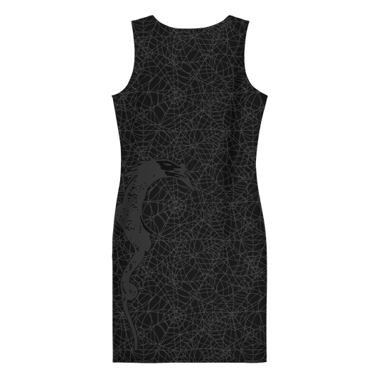 The Chapter One Bodycon dressThe base is a fitted silhouette — sleek, sharp, and tailored to accentuate. Overlaid across the grey-on-black fabric is a web of occult knowledge: spider silk symmetries laced like fate itself. Rising up from the shadows, the infamous dragon from The Satanic Bible coils...