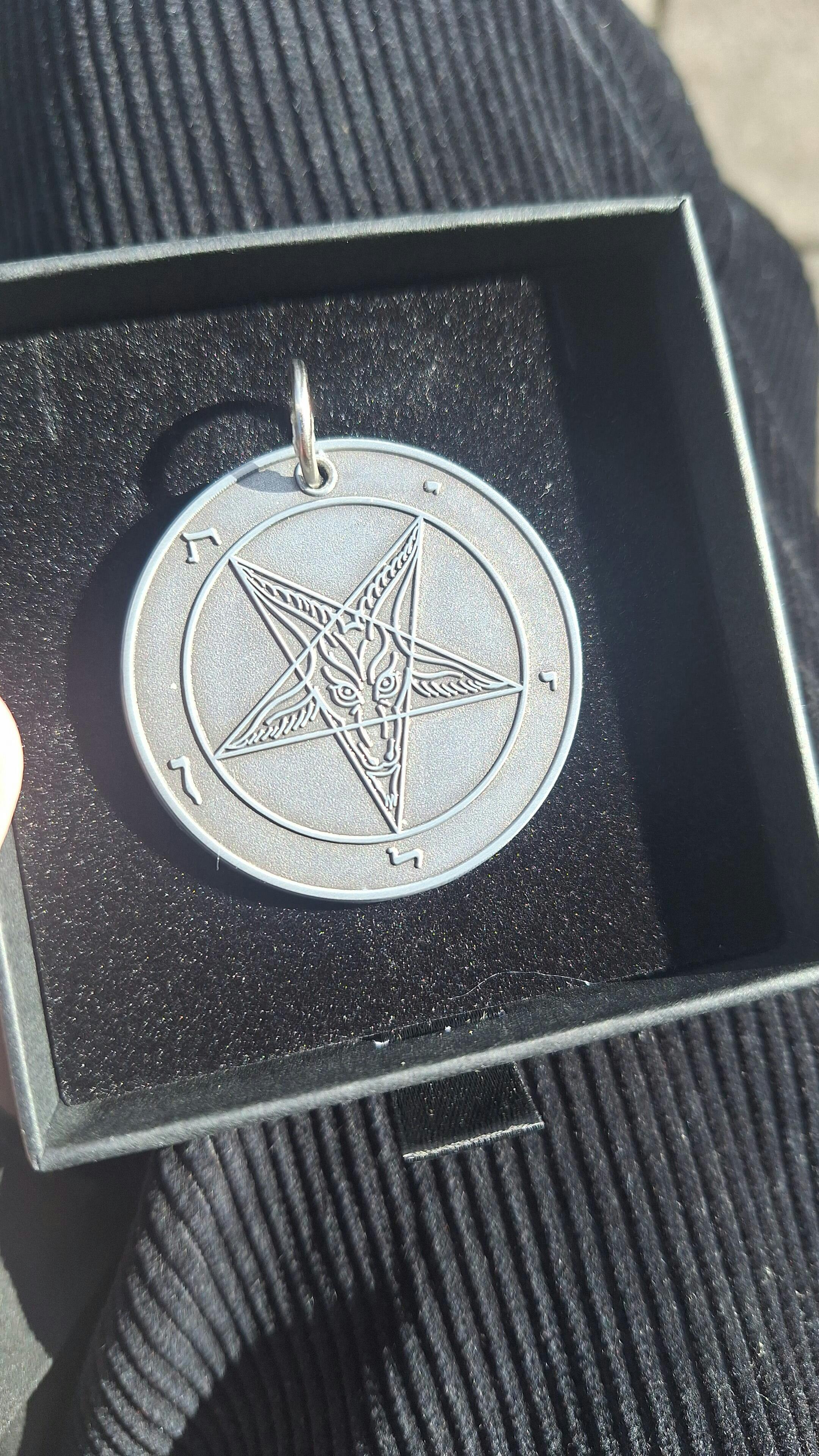 Officially licensed by the Church of Satan, these cloisonné medallions reinterpret the original design with reverence and refinement. Crafted in a custom-developed Antique Sandblasted Wash, each piece exudes depth, heritage, and quiet force.